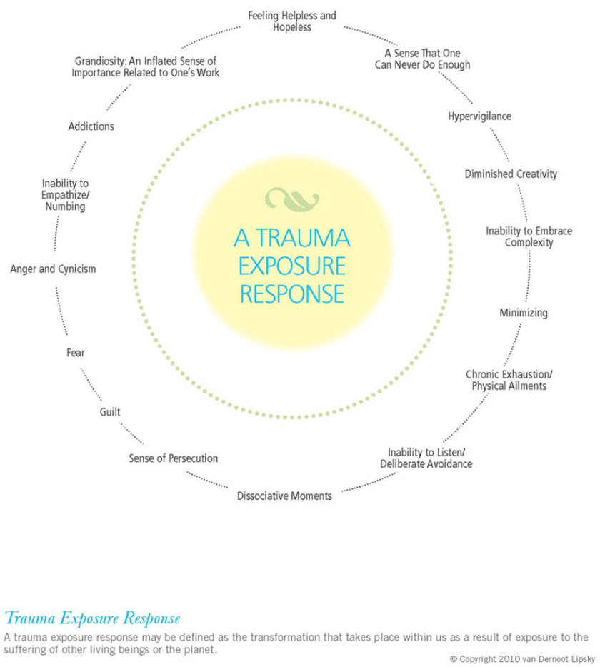 van Dernoot Lipsky posits that there are three levels of trauma stewardship: Personal Dynamics (our history, our relationships), Organizational Tendencies (culture, expectations, meaning of our contribution), and Societal Factors (values, systemic oppression).